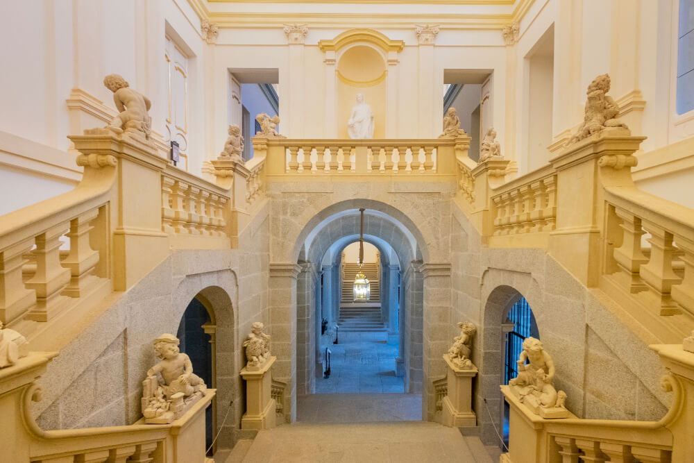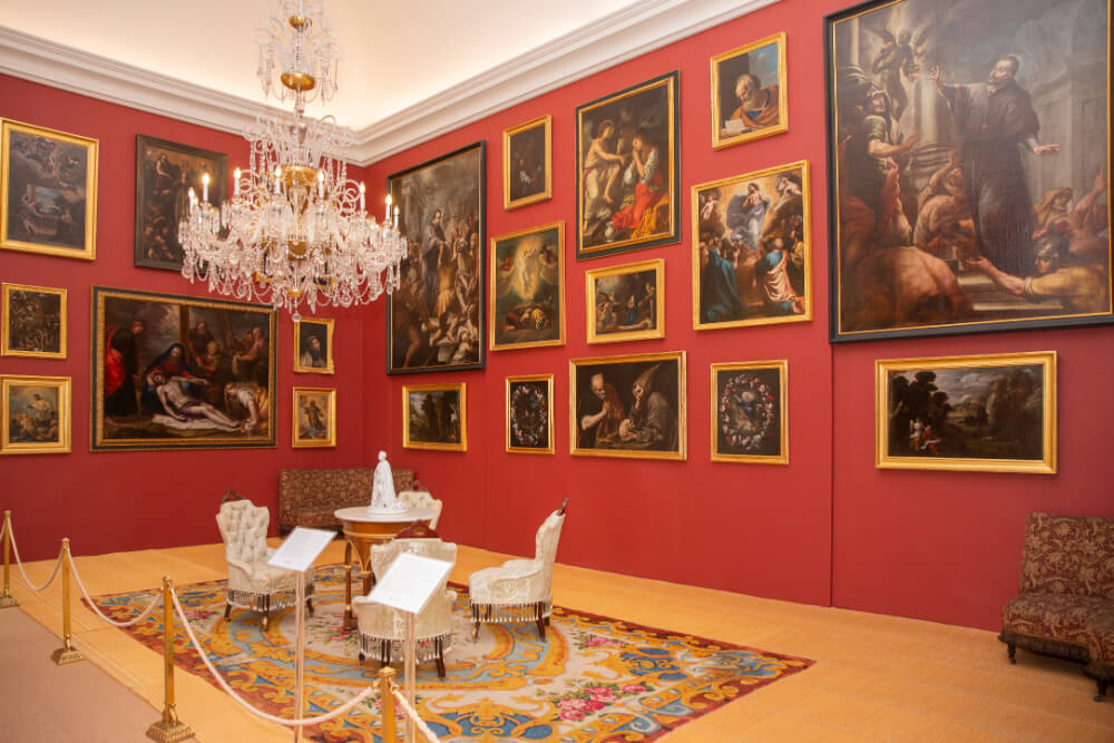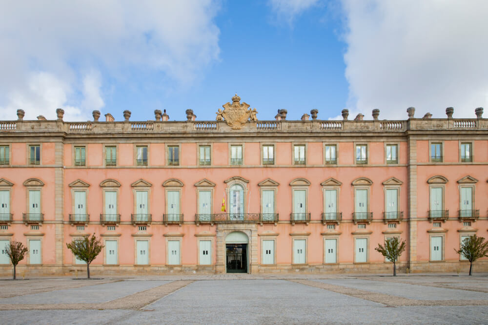 De grandes dimensiones con planta cuadrada y patio central, su exterior de tendencia tardo barroca es austero y sobrio, sin volúmenes, entrantes y salientes, utilizándose para completar su decoración la combinación de rosa y verde. Su interior, con grandes salas enfiladas, carece de bóvedas pintadas, conservando uno de los ejemplos más importantes de la arquitectura barroca en la escalera principal que arranca desde el vestíbulo en trayectorias opuestas. Al estilo de corte francesa, puertas, ventanas y balcones.